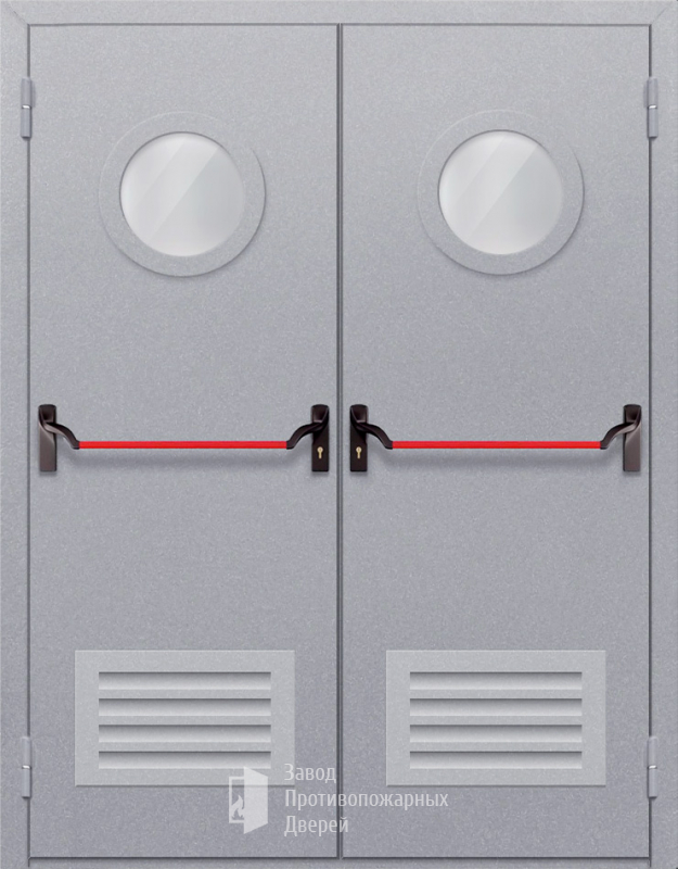 Маркировка Противопожарная Двупольная дверь с круглым стеклом ДПМ-02-EIW60 с решеткой и антипаникой